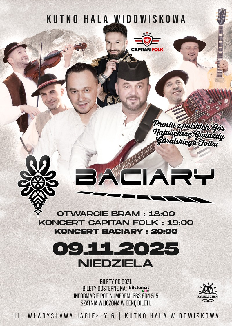 Już 9 listopada w Hali Widowiskowej w Kutnie wystąpią zespoły Capitan Folk oraz Baciary – jedne z najpopularniejszych grup prezentujących żywiołowy i niezwykle barwny folk góralski. To wydarzenie zapowiada się na muzyczne święto pełne energii, tańca i niezwykłej atmosfery.