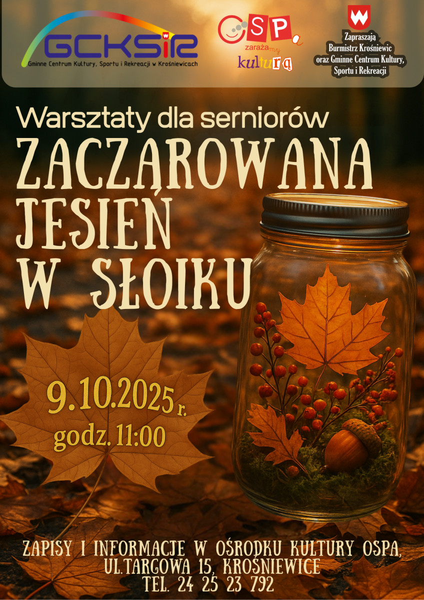W tym miesiącu nasze wydarzenia rozpoczynamy od 9 października, o godzinie 11:00 organizujemy warsztaty dla seniorów. Tutaj jest takie hasło, "Zamknij piękno jesieni w słoiku i zabierz je ze sobą do domu". A więc zapraszamy seniorów, by tą piękną jesień uwiecznić, upamiętnić, jakoś zachować w swoim sercu, ale również w pracach, które będą na tych warsztatach robione.