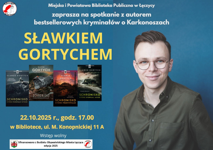Miejska i Powiatowa Biblioteka Publiczna w Łęczycy zaprasza wszystkich miłośników literatury na wyjątkowe spotkanie ze Sławomirem Gortychem – autorem bestsellerowej Karkonoskiej serii kryminalnej. Wydarzenie odbędzie się 22 października 2025 roku (środa) o 17:00 w siedzibie biblioteki.