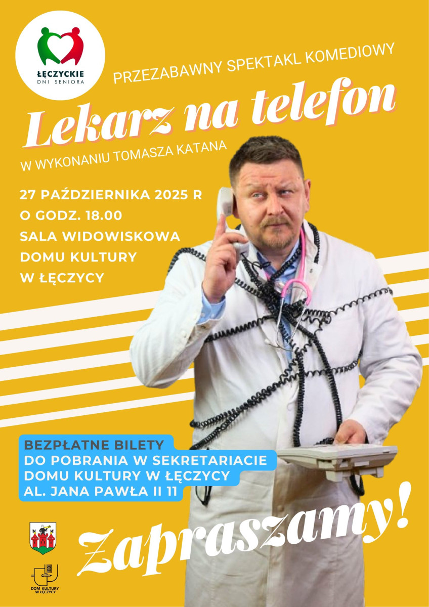 Już w poniedziałek, 27 października, w sali widowiskowej Domu Kultury w Łęczycy odbędzie się spektakl pt. „Lekarz na telefon” – przezabawną komedię zaprezentuje znany aktor Tomasz Katan.