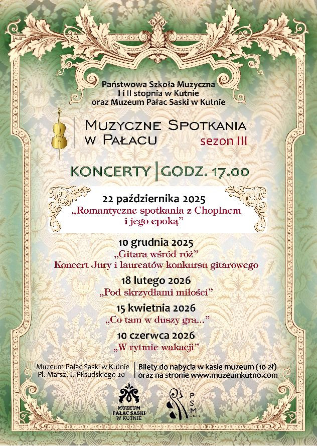 To wyjątkowa inicjatywa organizowana wspólnie przez Państwową Szkołę Muzyczną I i II stopnia im. Karola Kurpińskiego w Kutnie oraz Muzeum Pałac Saski w Kutnie. W jej ramach swoje talenty prezentują uczniowie i nauczyciele szkoły muzycznej, a koncerty odbywają się w nastrojowych wnętrzach pałacu, tworząc niezapomnianą atmosferę spotkania ze sztuką.
