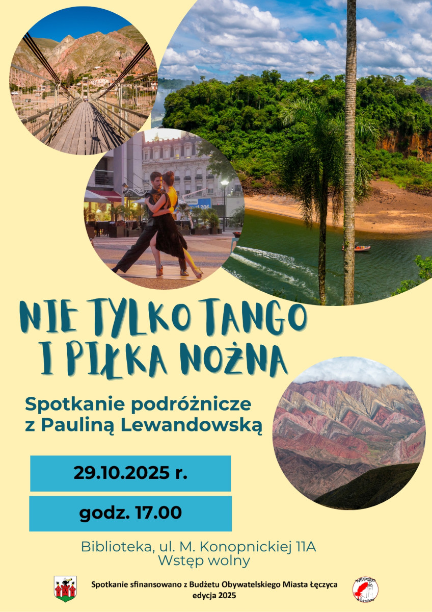 Miejska i Powiatowa Biblioteka Publiczna w Łęczycy serdecznie zaprasza na wyjątkowe spotkanie z podróżniczką Pauliną Lewandowską, zatytułowane „Nie tylko tango i piłka nożna – życie i podróże w argentyńskim stylu”, które odbędzie się w środę, 29 października 2025 r., o 17:00 w siedzibie biblioteki.