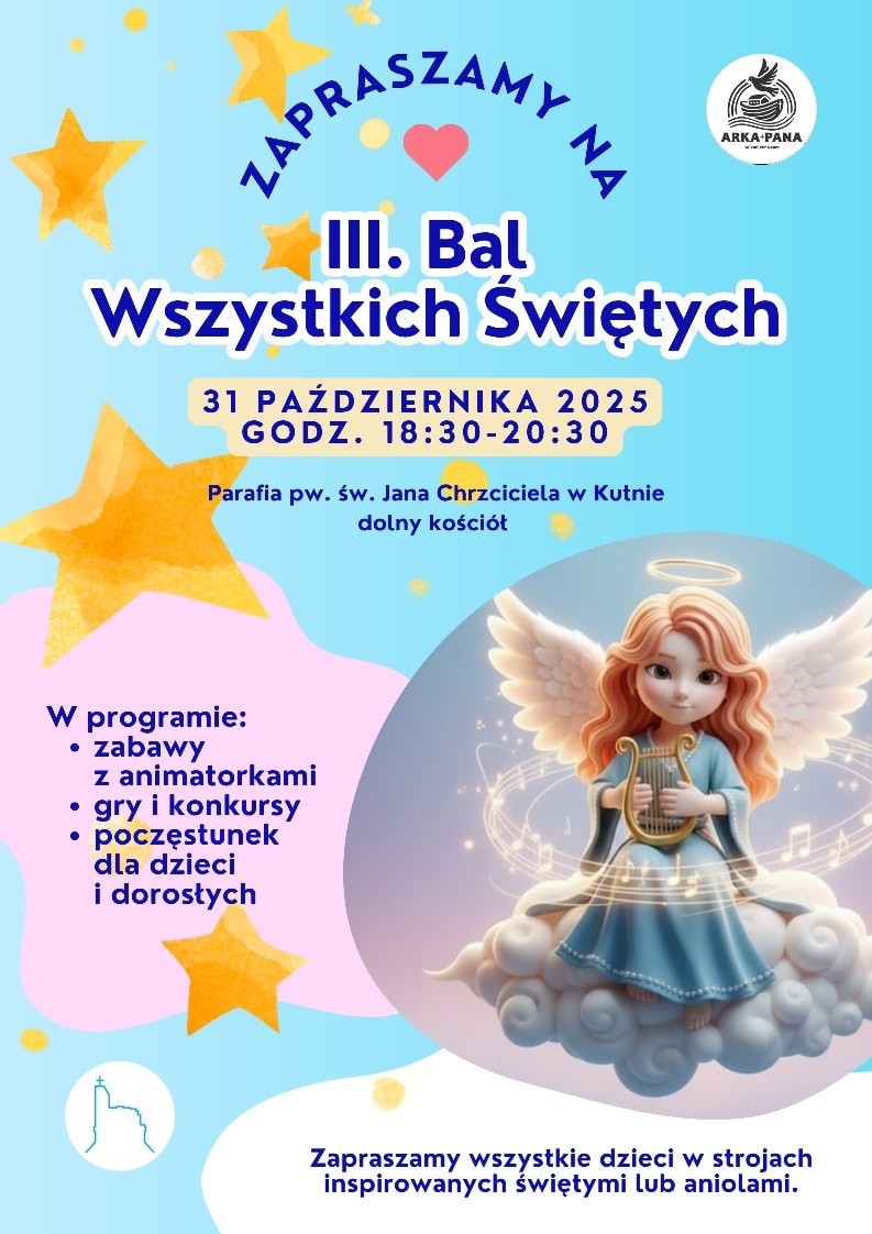 Parafia św. Jana Chrzciciela w Kutnie wraz ze wspólnotą Arka Pana serdecznie zapraszają wszystkie dzieci z Kutna i okolic na trzeci Parafialny Bal Wszystkich Świętych! Wydarzenie odbędzie się 31 października (piątek) w godzinach od 18:30 do 20:30.
