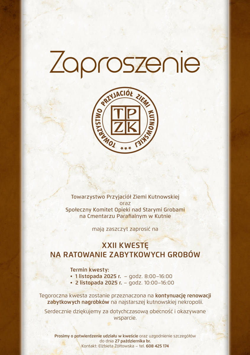 Tradycyjnie w dniach 1 i 2 listopada Towarzystwo Przyjaciół Ziemi Kutnowskiej organizuje kwestę na ratowanie zabytkowych nagrobków na cmentarzu parafialnym w Kutnie. W tym roku zbiórka odbędzie się po raz 22.