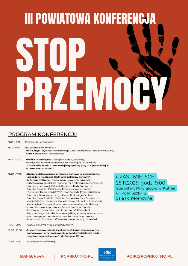 Dziś (25.11.) zorganizowana została III Powiatowa Konferencja „Stop Przemocy”, poświęcona zagadnieniom przeciwdziałania przemocy w rodzinie oraz ochrony osób doświadczających krzywdzenia. Wydarzenie gromadzi specjalistów z obszaru pomocy społecznej, prawa, interwencji kryzysowej oraz przedstawicieli instytucji pracujących na rzecz bezpieczeństwa mieszkańców powiatu kutnowskiego.