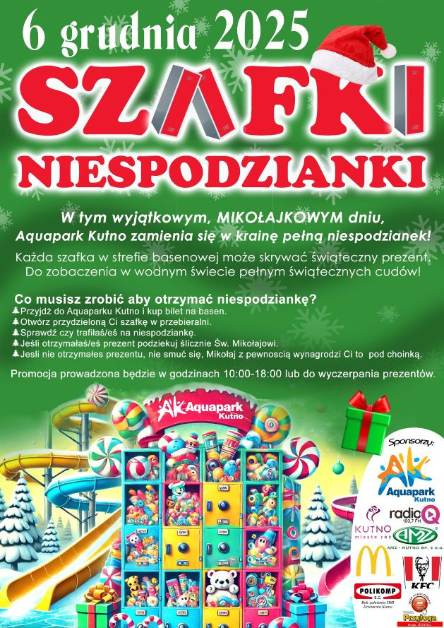 Już 6 grudnia Aquapark Kutno zaprasza mieszkańców miasta i regionu na wyjątkowe, pełne świątecznej magii wydarzenie „Szafki Niespodzianki”. Tegoroczne Mikołajki przyniosą odwiedzającym nie tylko relaks i wodną zabawę, ale również szansę na zdobycie wyjątkowych prezentów ukrytych w… szafkach basenowych.