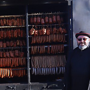 Przyjechałem do Państwa z miejscowości Szare. Jest to daleko w Beskidach, czyli między Milówką a Koniakowem, gmina Milówka, powiat żywiecki, województwo śląskie. Mamy kaszankę żywiecką z kaszą jęczmienną, troszeczkę zmielonej wątróbki, trochę pieprzu, który dodaje pikanterii, są kabanosy. Mam kiełbasę chłopską. A dlaczego chłopska? Bo jak szedł chłop do roboty, musiał zjeść coś konkretnego, dlatego ta kiełbasa tak się nazywa. Ma więcej mięsa, mniej tłuszczyku. Kiełbaska swojska, która jest na zimno, na ciepło. Ją się daję do żurku i do bigosu - rewelacyjna. To moje wyroby, także nic nie oszukiwane.