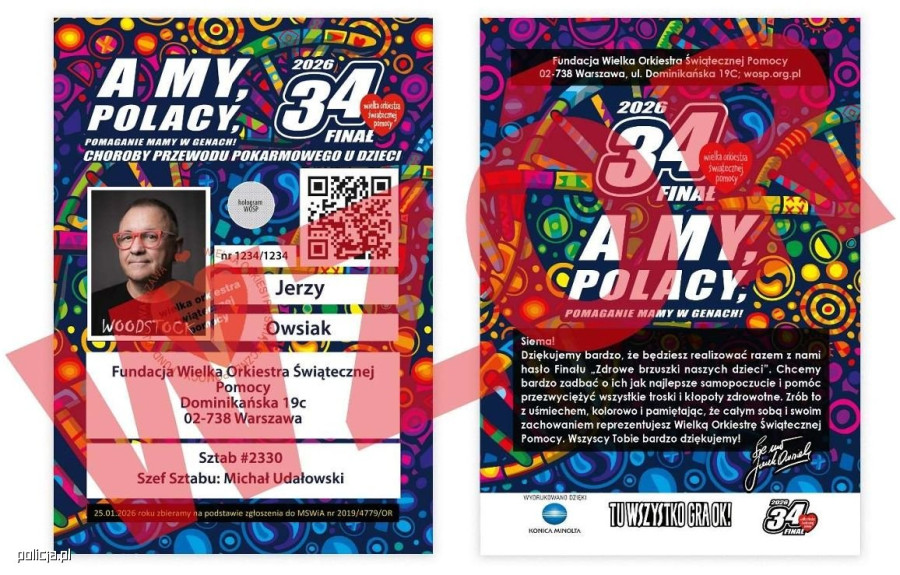 Nieodzownym atrybutem wolontariuszy są wszystkim doskonale znane „serduszkowe” naklejki. Jeśli zaistnieje podejrzenie, że ktoś podszywa się pod wolontariusza WOŚP i posługuje się podrobionym identyfikatorem lub podejrzanie wyglądającą puszką, należy skontaktować się z Policją lub Strażą Miejską / Gminną.