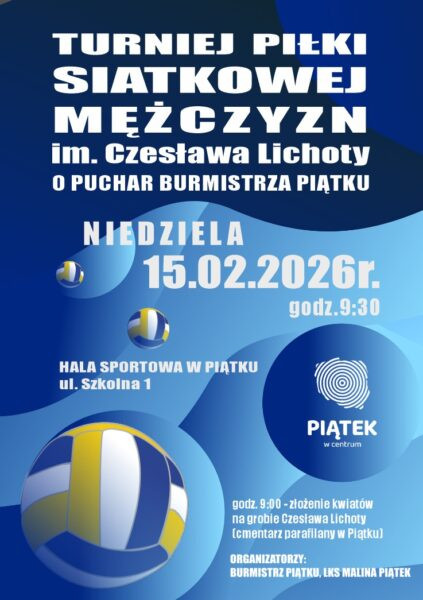 Luty w Piątku upłynie pod znakiem siatkówki na najwyższym poziomie. Burmistrz Piątku Anna Matusiak oraz Prezes LKS Malina Tomasz Kucharczyk serdecznie zapraszają na XVII edycję Turnieju Piłki Siatkowej Mężczyzn im. Czesława Lichoty o Puchar Burmistrza Piątku.