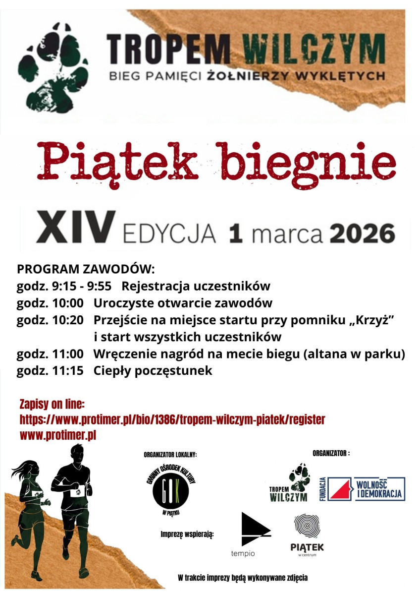 Świetne wieści z Piątku dla fanów sportu! Gminny Ośrodek Kultury w Piątku został oficjalnie organizatorem lokalnego biegu "Tropem Wilczym" po kilku latach przerwy. To już XIV edycja tego kultowego już wydarzenia, które rozpocznie się 1 marca 2026 roku.