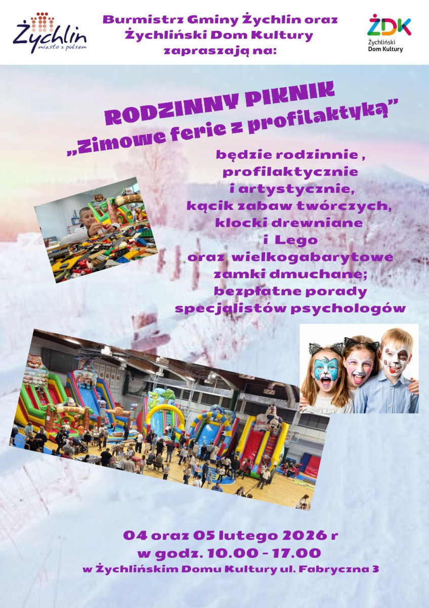 Burmistrz Gminy Żychlin oraz Żychliński Dom Kultury zapraszają na zimowy piknik pt. "Zimowe Ferie z Profilaktyką". Wydarzenie odbędzie się 4 oraz 5 lutego w godzinach 10:00 - 17:00 w ŻDK przy ul. Fabrycznej 3. To dwa dnie pełne zabawy, edukacji oraz bezpłatnych porad dla dzieci od specjalistów.