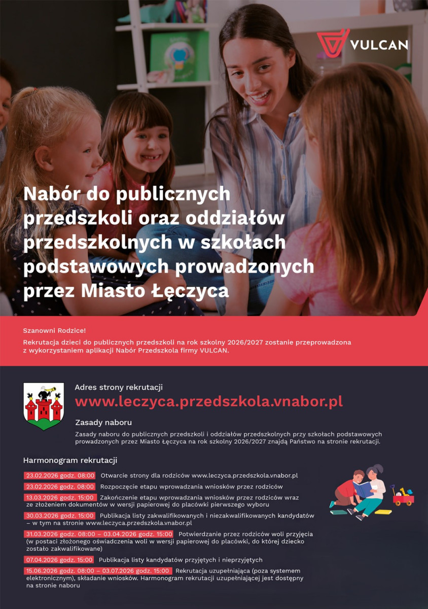 Jak informuje Urząd Miejski w Łęczycy, rekrutacje są przeprowadzane przez aplikacje internetowe "Nabór" oraz "Nabór Przedszkola" firmy Vulcan. Zarówno do placówek rejonowych, jak i spoza obwodu, dzieci można zgłaszać od godz. 8.00, 23 lutego do godz. 15.00, 03 marca. W przypadku szkół podstawowych poza wprowadzeniem wniosków do systemu informatycznego konieczne jest złożenie dokumentów w formie papierowej do placówki pierwszego wyboru.