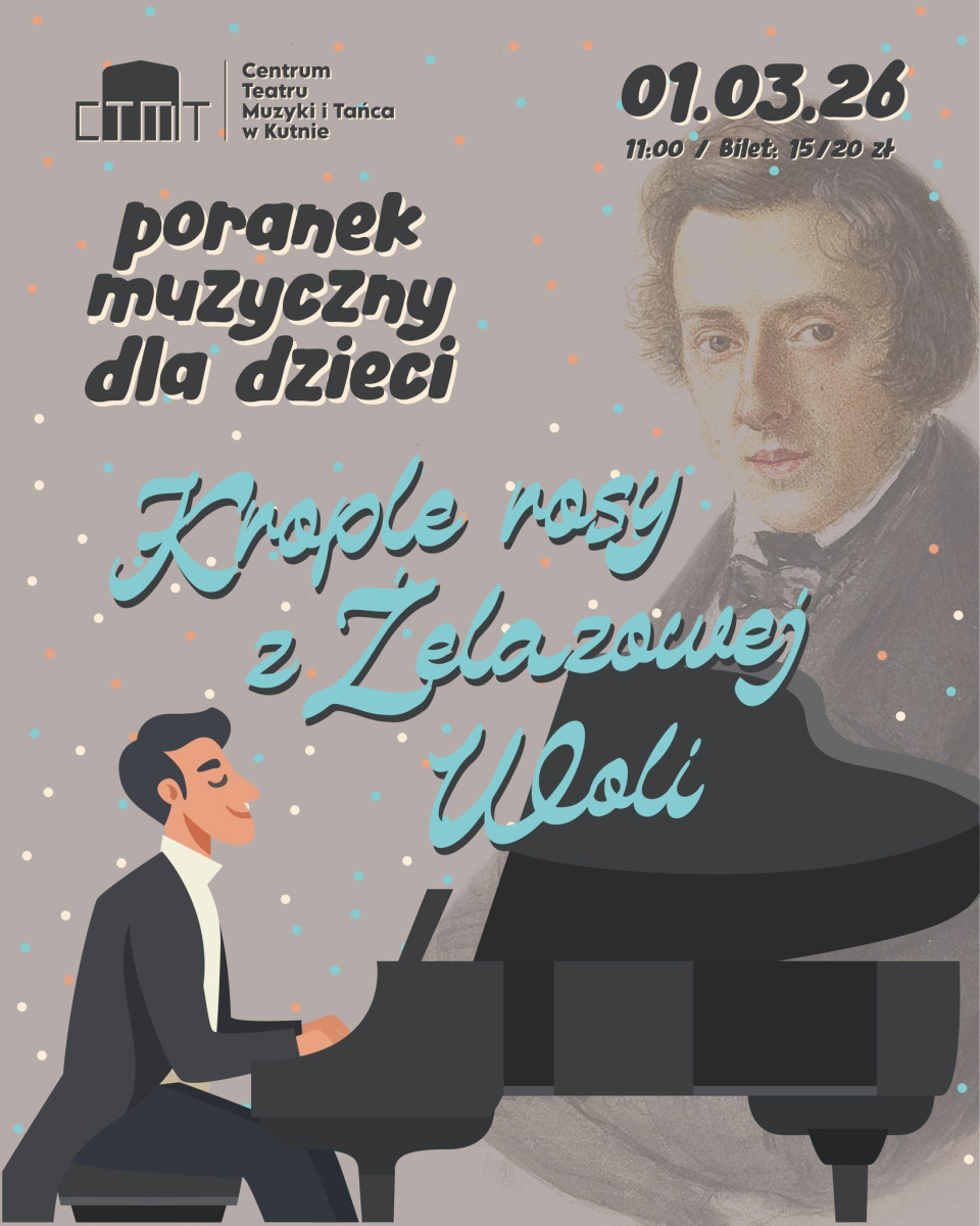Wyjątkowa propozycja dla najmłodszych melomanów już w niedzielę, 1 marca. W Centrum Teatru Muzyki i Tańca w Kutnie odbędzie się kolejny poranek muzyczny dla dzieci pod hasłem Krople rosy z Żelazowej Woli.