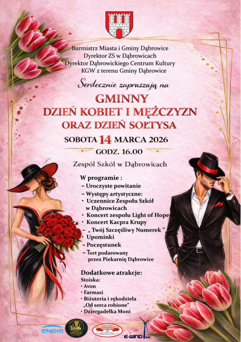 Mieszkańcy Miasta i Gminy Dąbrowice mają powody do radosnego świętowania. Już w sobotę, 14 marca, odbędą się wspólne obchody Gminnego Dnia Kobiet i Mężczyzn oraz Dnia Sołtysa. Wydarzenie rozpocznie się o godzinie 16:00 w murach Zespołu Szkół w Dąbrowicach.