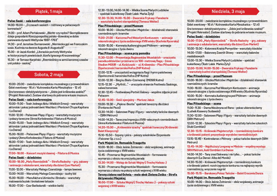 Festiwal Saski to dziś nie tylko wydarzenie historyczne, ale także ważna wizytówka Kutna. Jak podkreślają organizatorzy, Kutno staje się coraz bardziej rozpoznawalne w całej Polsce. Tegoroczna edycja zapowiada się wyjątkowo atrakcyjnie, odbędzie się ona 1 - 3 maja w wielu znanych miejscach Miasta Róż.