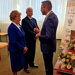 Wójt Gminy pogratulował jubilatom wspólnie spędzonych lat, skierował wyrazy uznania oraz życzył pomyślności i kolejnych lat trwania w związku w pełnym zdrowiu.