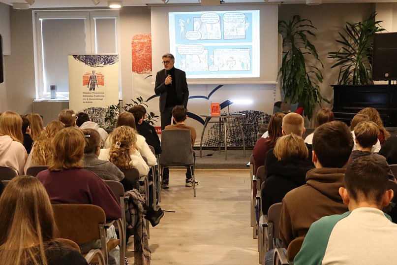 W piątek 20 lutego młodzież z kutnowskich szkół miała okazję wziąć udział w wykładzie profesora Michała Rusinka - sekretarza Wisławy Szymborskiej, który odwiedził Miejską i Powiatową Bibliotekę Publiczną w Kutnie aby przekazać w przystępny sposób swoją wiedzę z teorii retoryki.